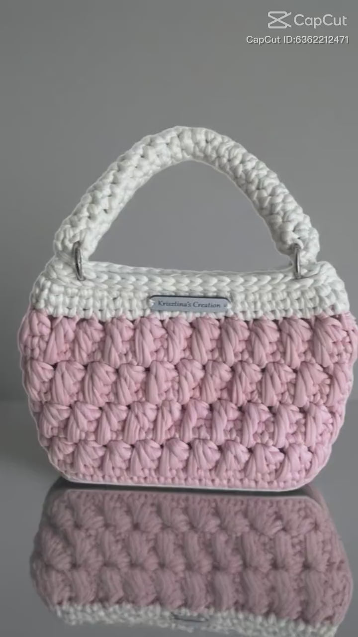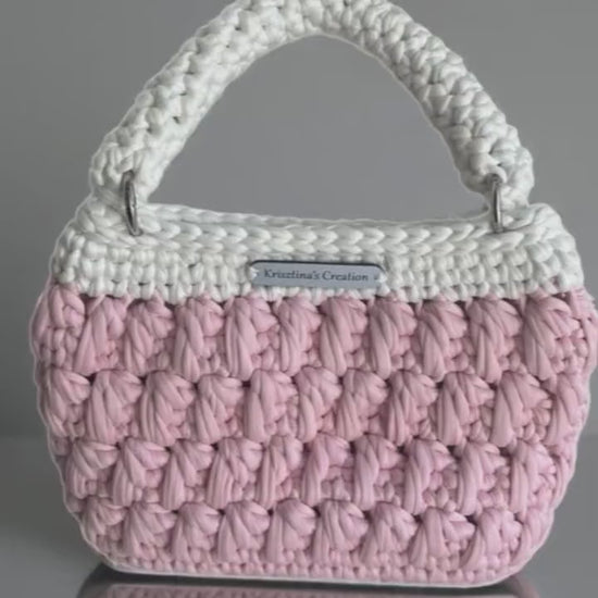 Expertly crocheted with elastic T-shirt yarn, our light pink and white bag boasts a chic, durable design. The inside linen adds a touch of sophistication and the magnetic bottom ensures secure closure. At 23x6x16 cm, this bag is perfect for all occasions.