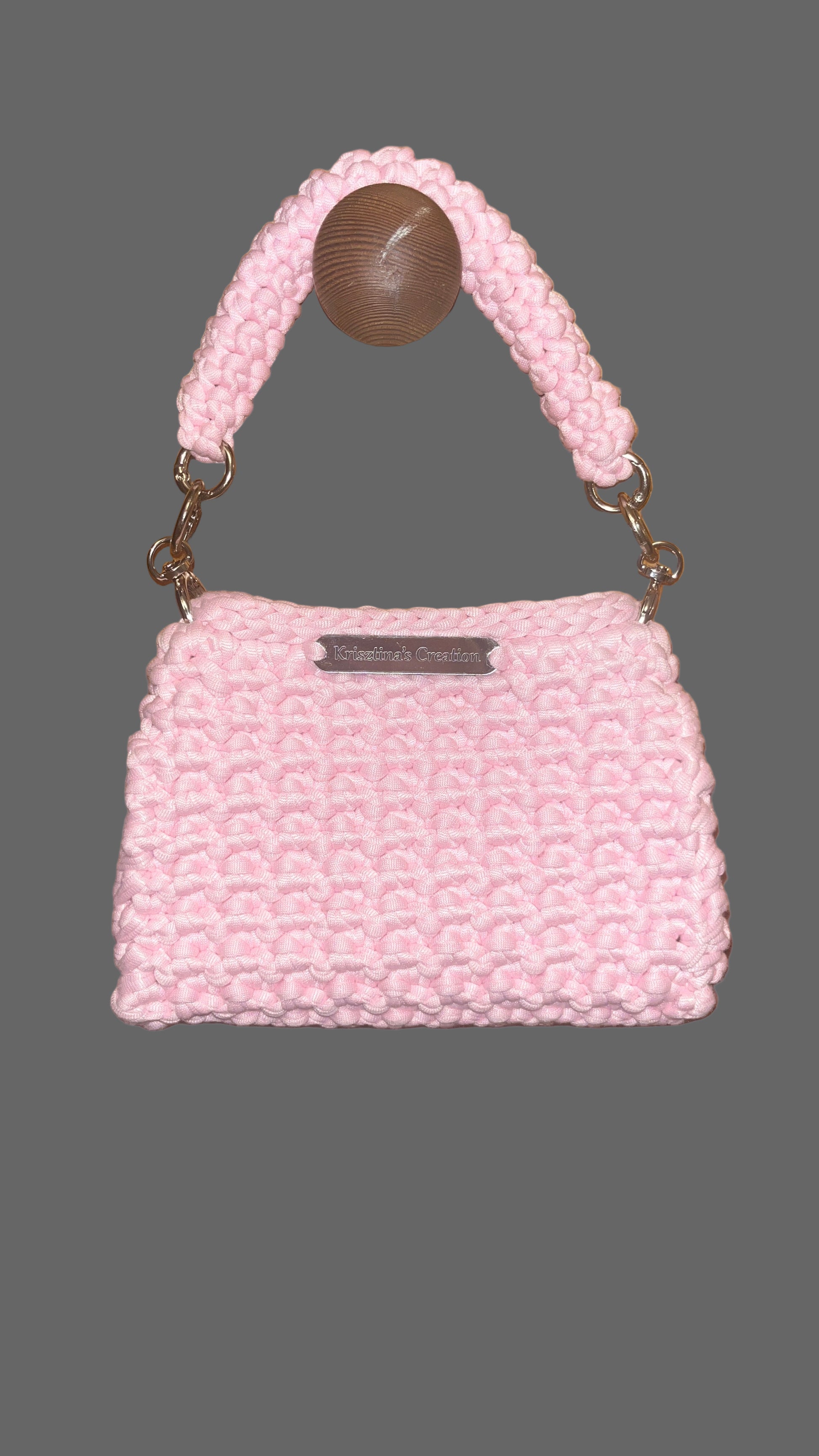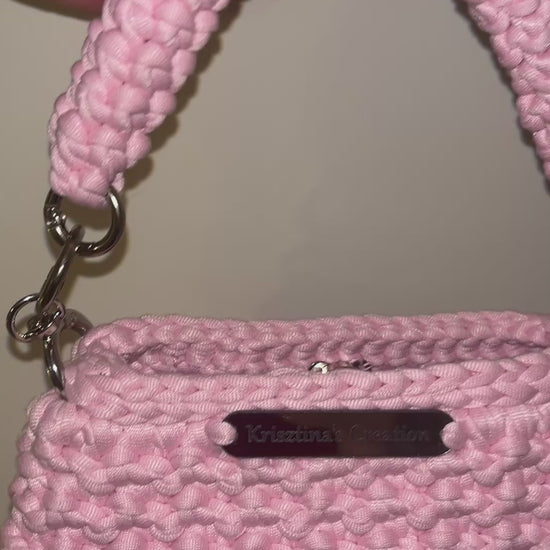 Elevate your style with the Pretty Pinky handbag. This crocheted T-shirt yarn bag measures 17x6x11 cm and features a top handle and magnetic button. Versatile for any occasion, it's perfect for teens or ladies.