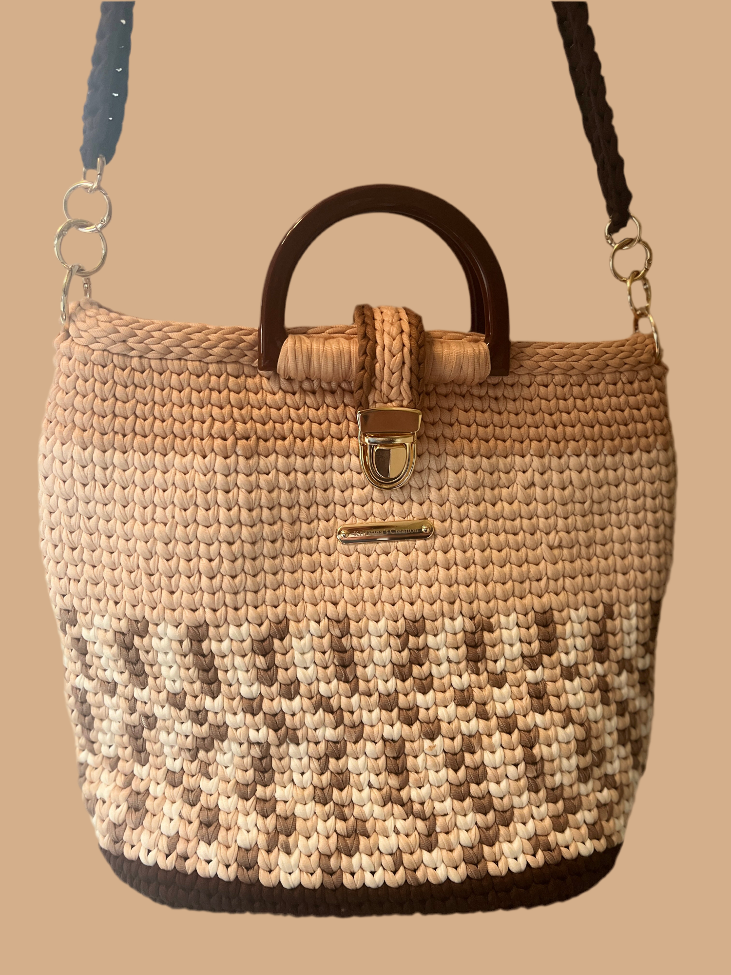 Introducing our Shoulder bag with a D handle and strap. With a bag size of 28x12x32cm and a shoulder strap length of 80cm, it's perfect for all ages and occasions. Made from elastic T-shirt yarn with a beige and brown colour combination, it also features a brown D handle, golden buckle closer, and leatherette bag bottom. Enjoy a new customer discount at checkout and free shipping on orders over £20. Don't miss out on this versatile and stylish bag!